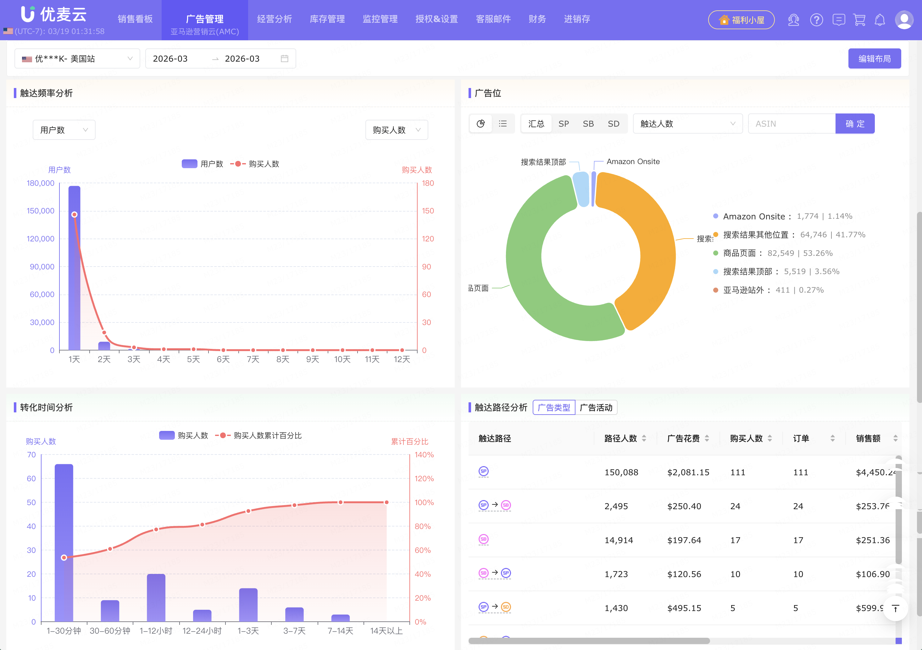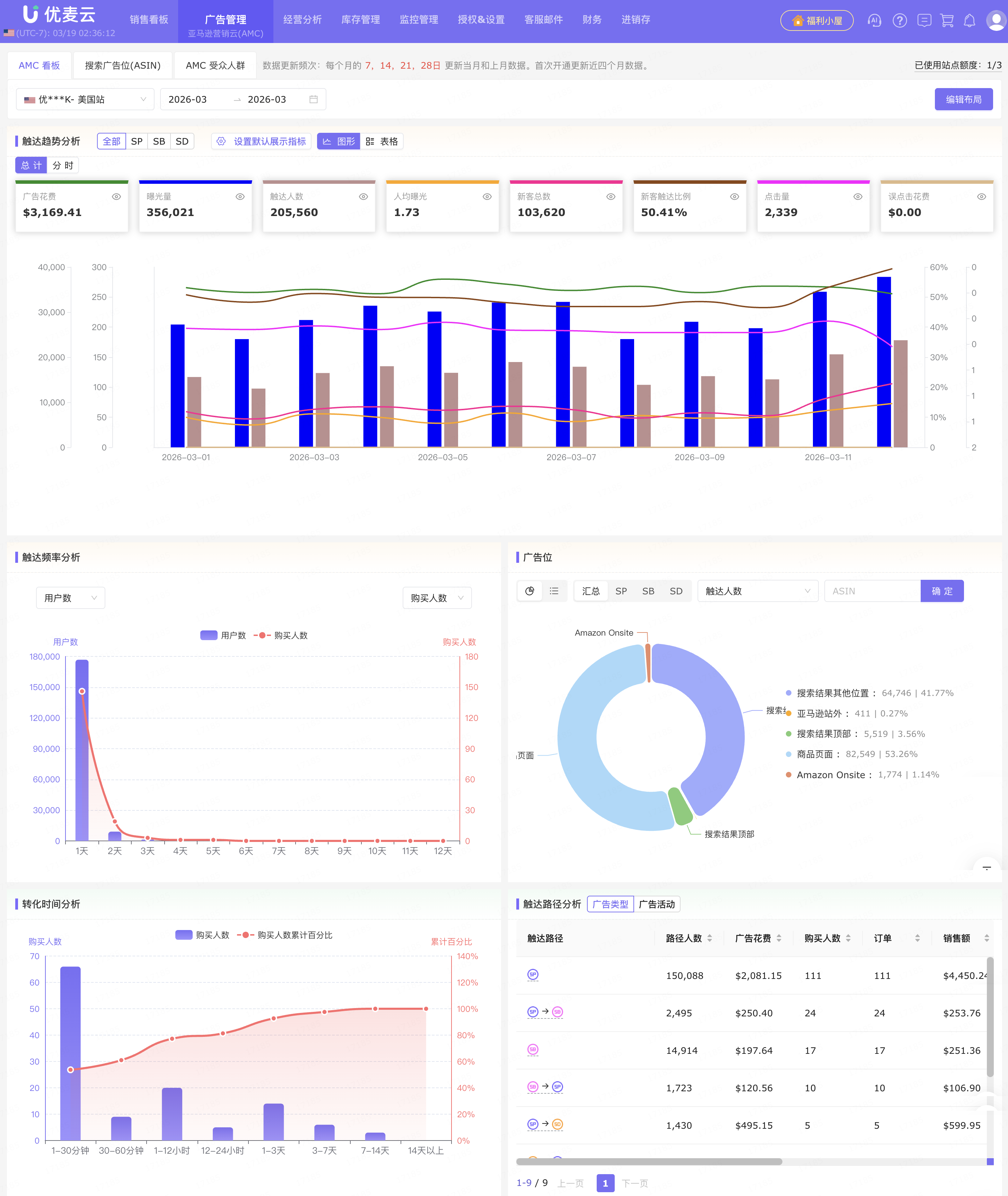 成功开通后,即可通过优麦云AMC的五大数据看板:触达趋势分析、触达频率分析、广告位、转化时间分析、触达路径分析,与搜索广告位(ASIN)报告来洞察用户购买行为,进而基于不同分析结果,创建受众人群包,进行定向投放。