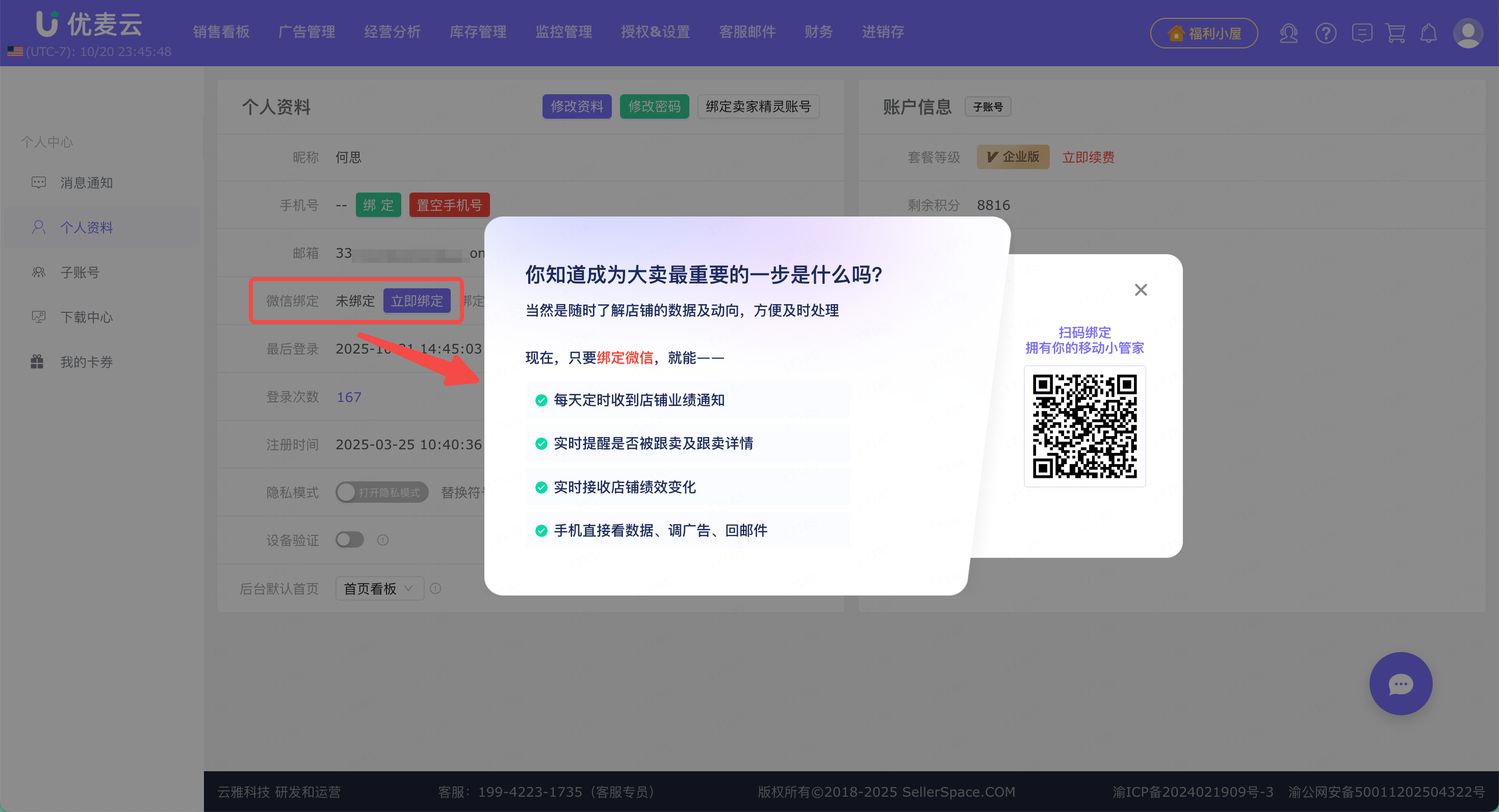 优麦云的「跟卖监控」功能,可以监控店铺内所有的商品跟卖情况,并通过微信实时提醒。想要接收跟卖提醒,需提前绑定微信。