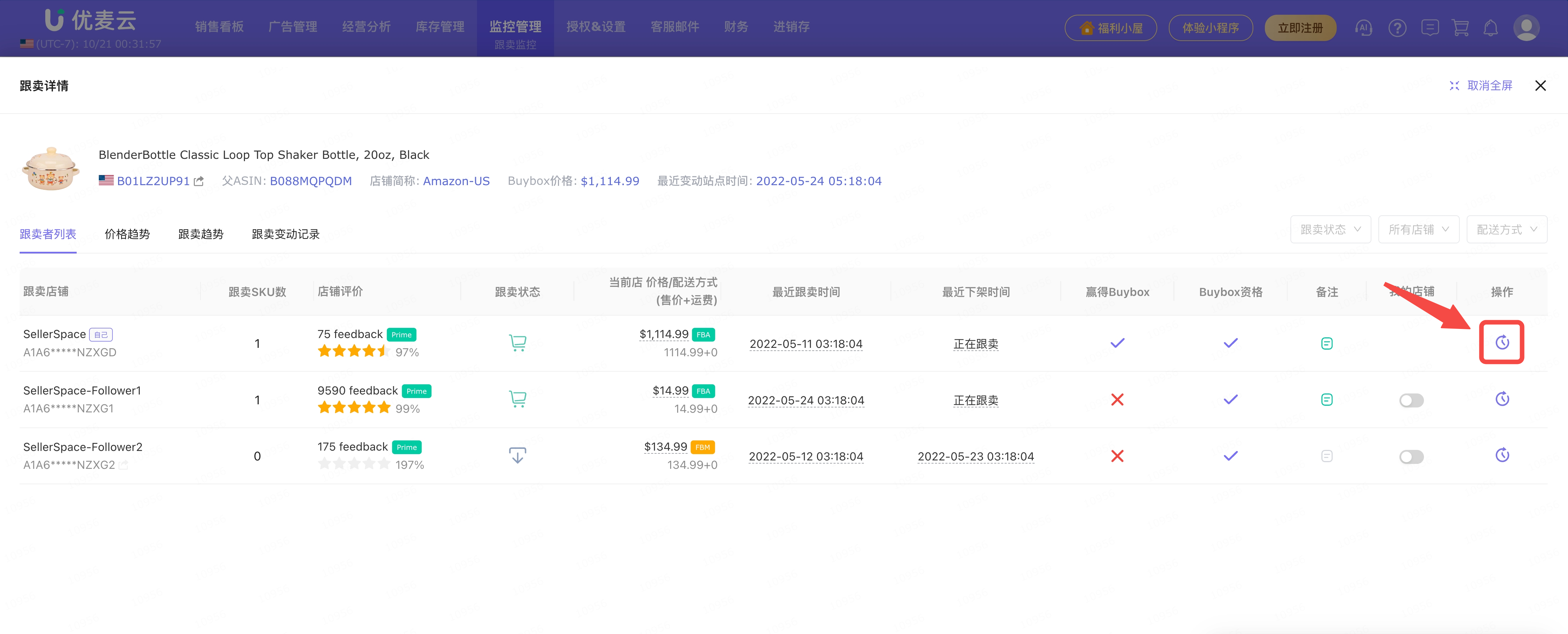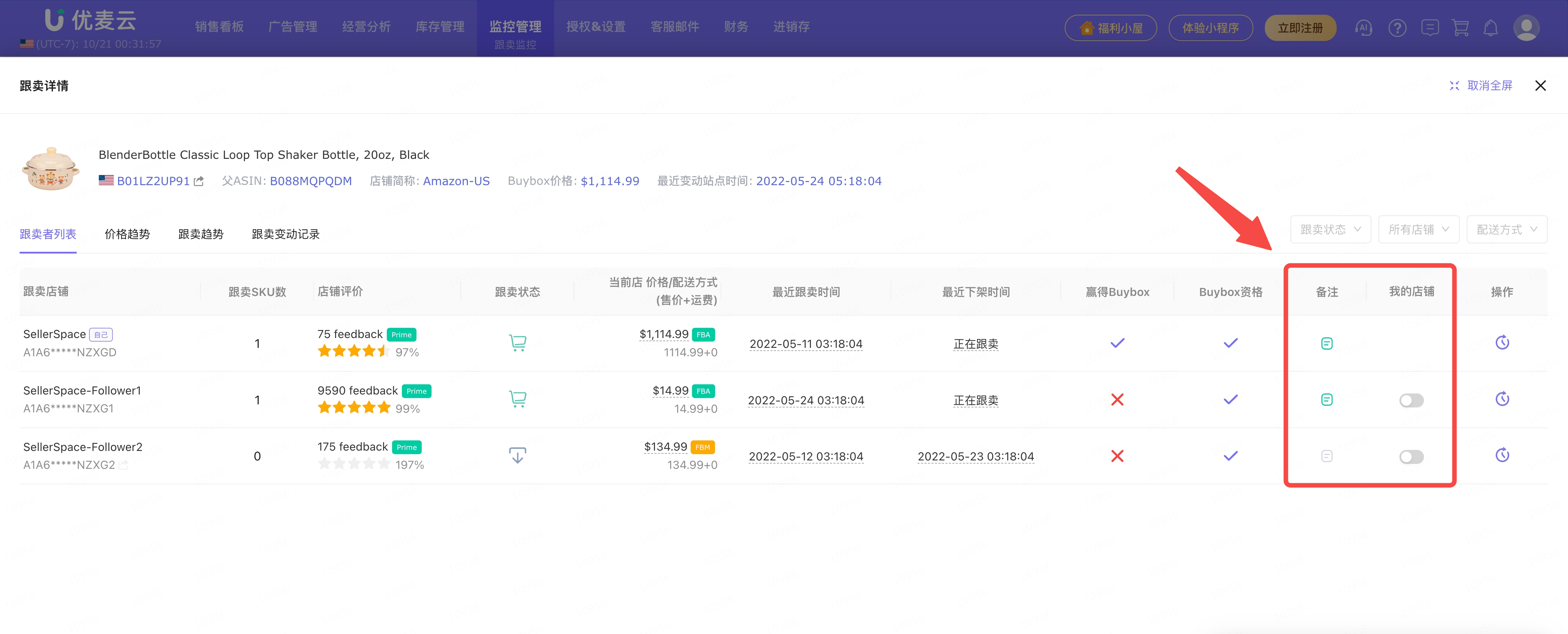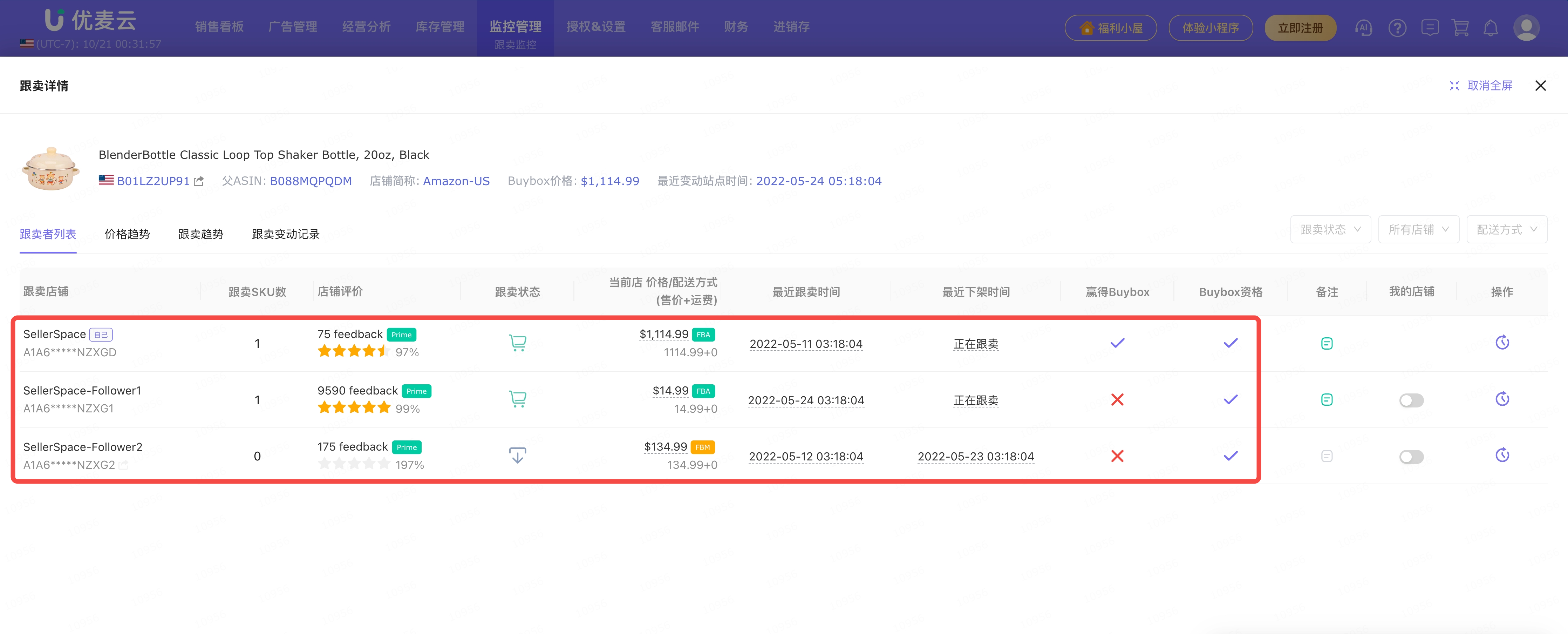 来了跟卖,我们可以在优麦云网页版后台的功能页面,直接查看跟卖详情,包括:被跟卖商品信息、当前跟卖数、当前卖家数、BuyBox赢得者、BuyBox价格、FBA/FBM最低价、最近站点变动时间。