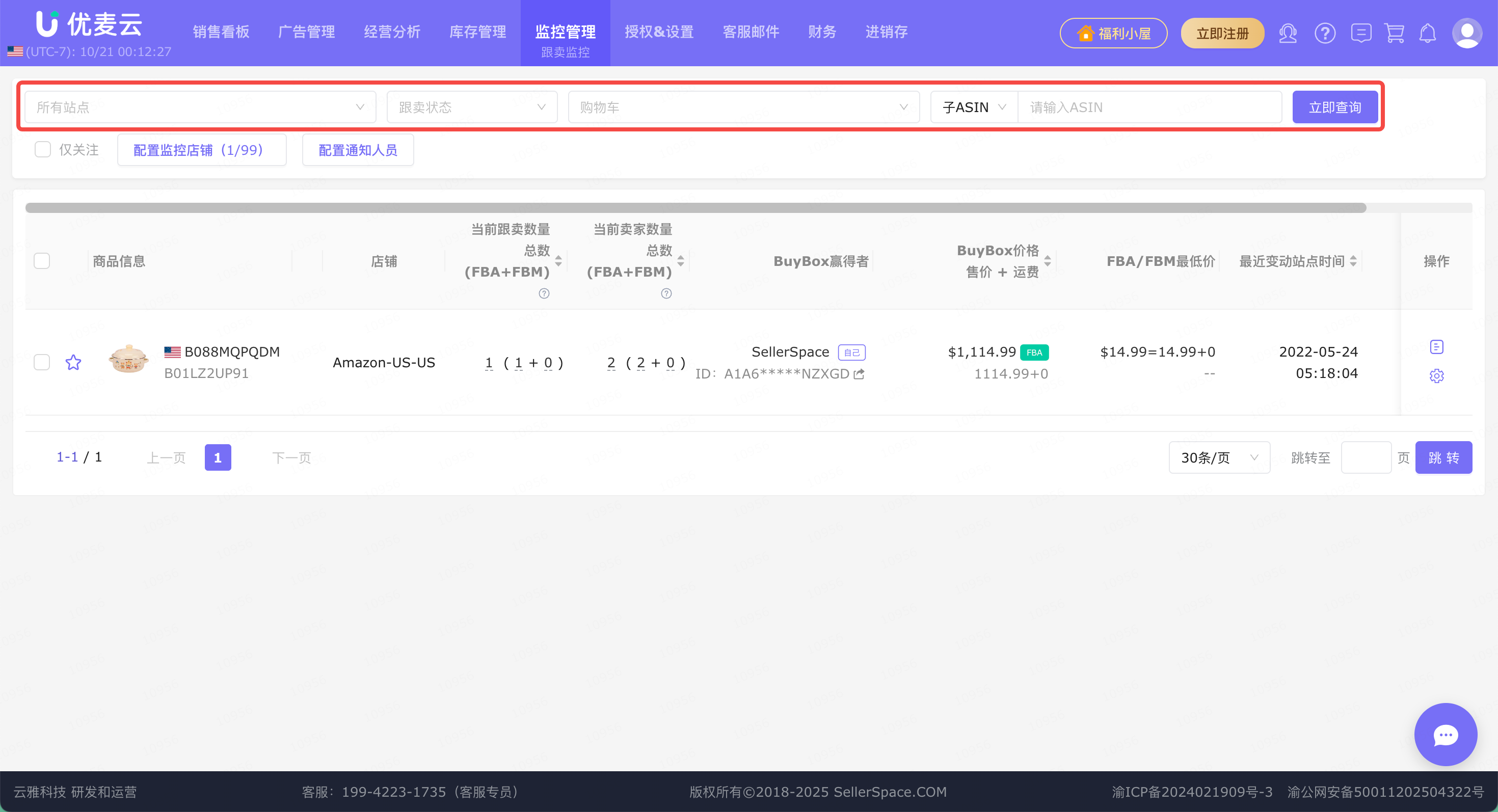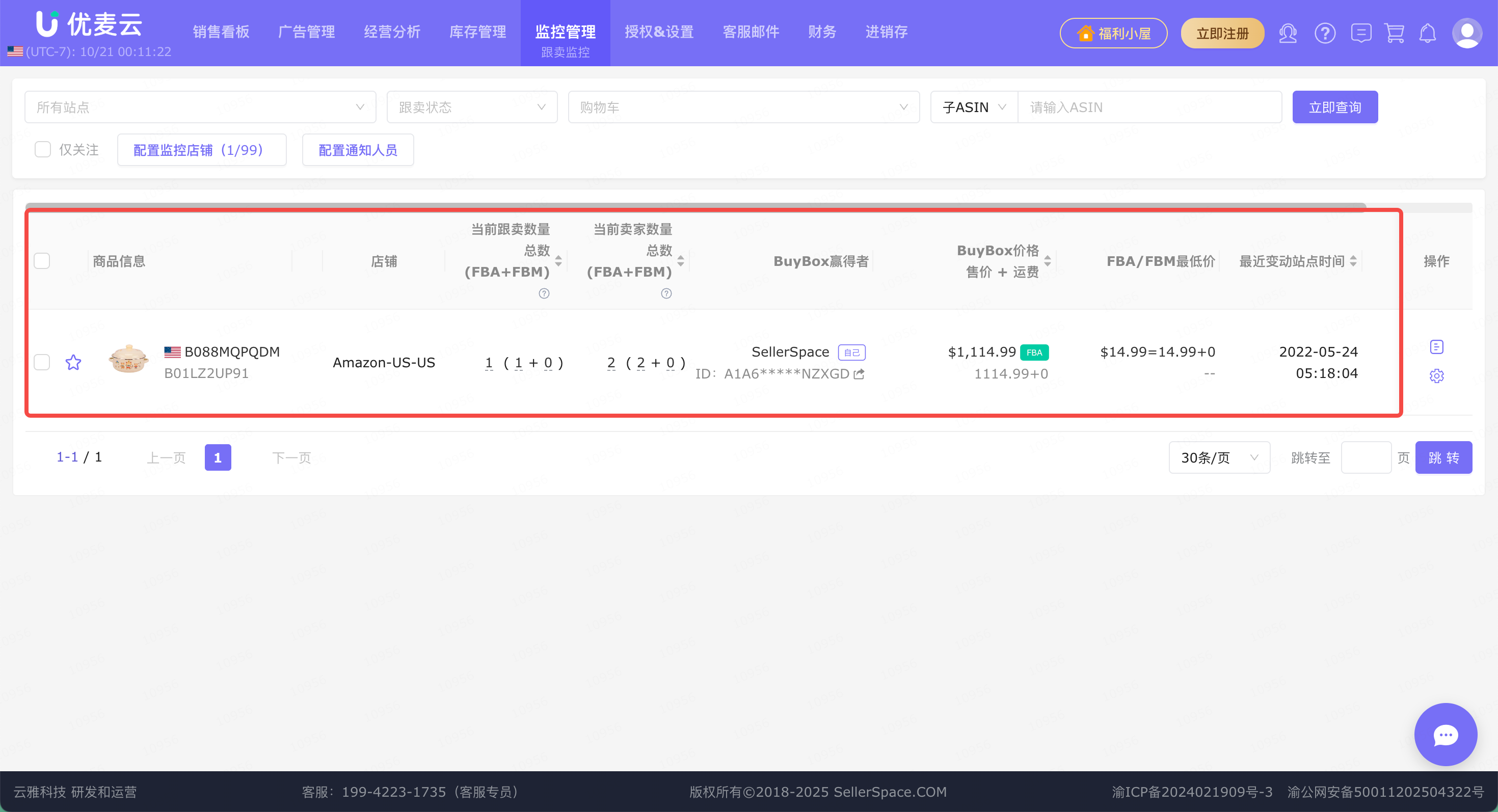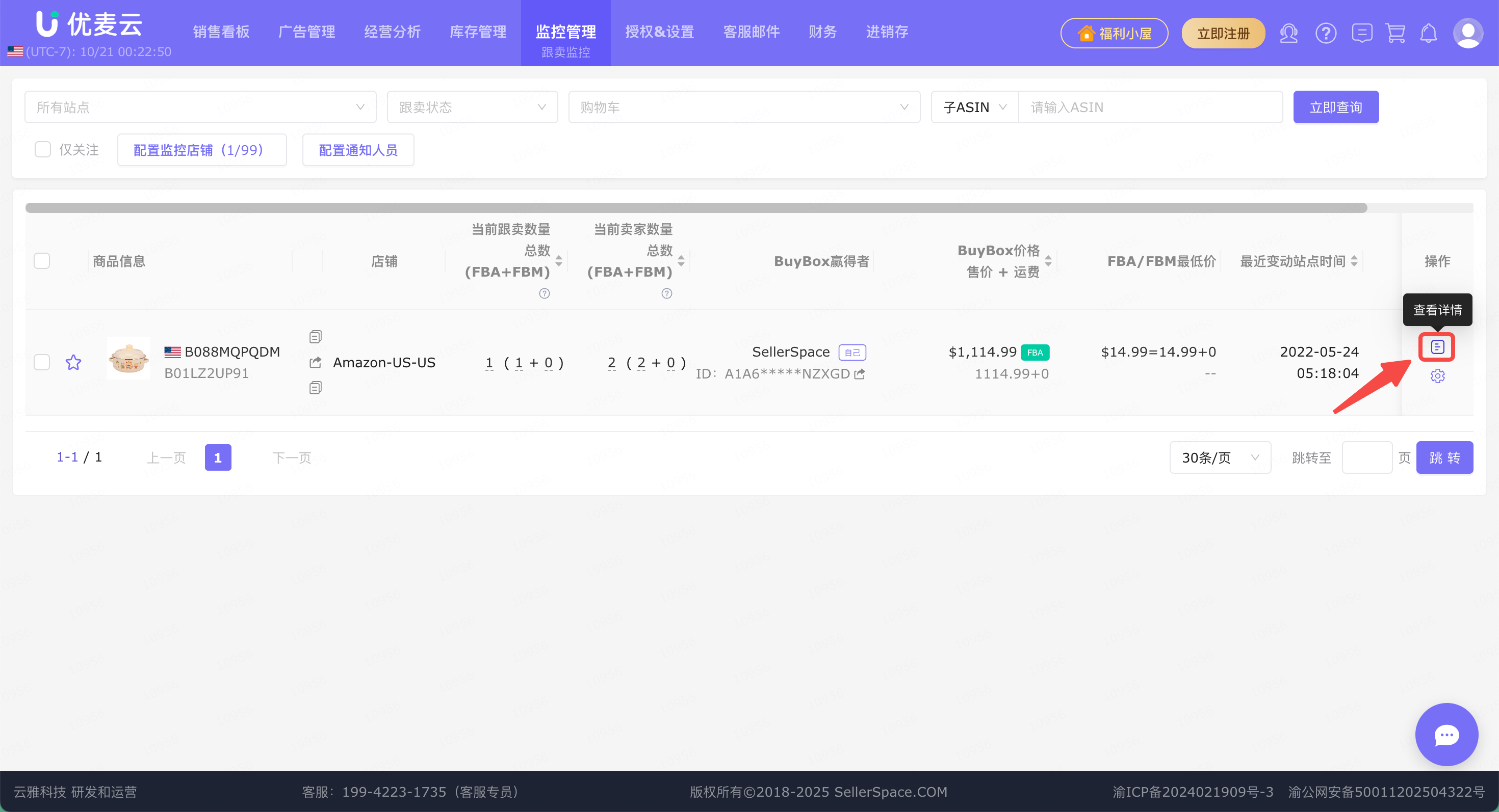 来了跟卖,我们可以在优麦云网页版后台的功能页面,直接查看跟卖详情,包括:被跟卖商品信息、当前跟卖数、当前卖家数、BuyBox赢得者、BuyBox价格、FBA/FBM最低价、最近站点变动时间。