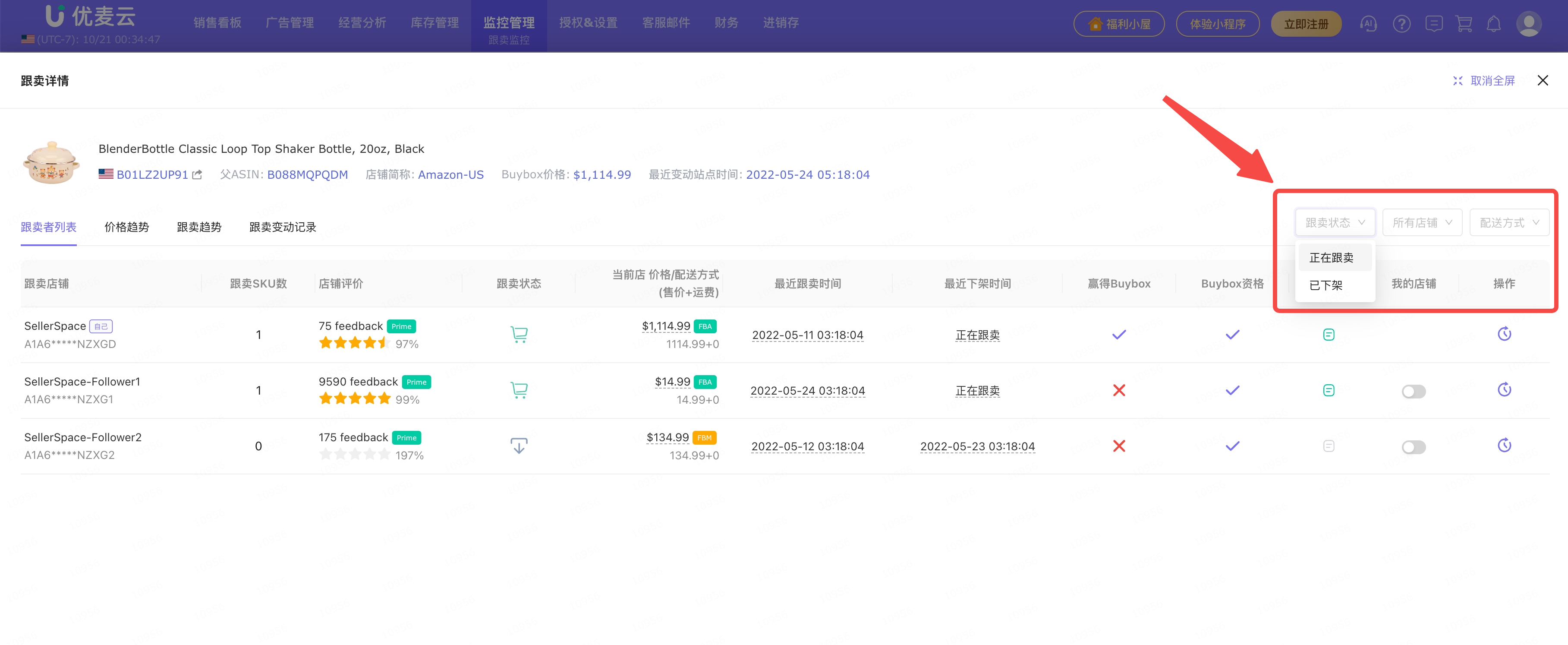 如果历史跟卖者较多,可以通过筛选:跟卖状态、店铺、配送方式,来查找对应的历史跟卖者信息。
