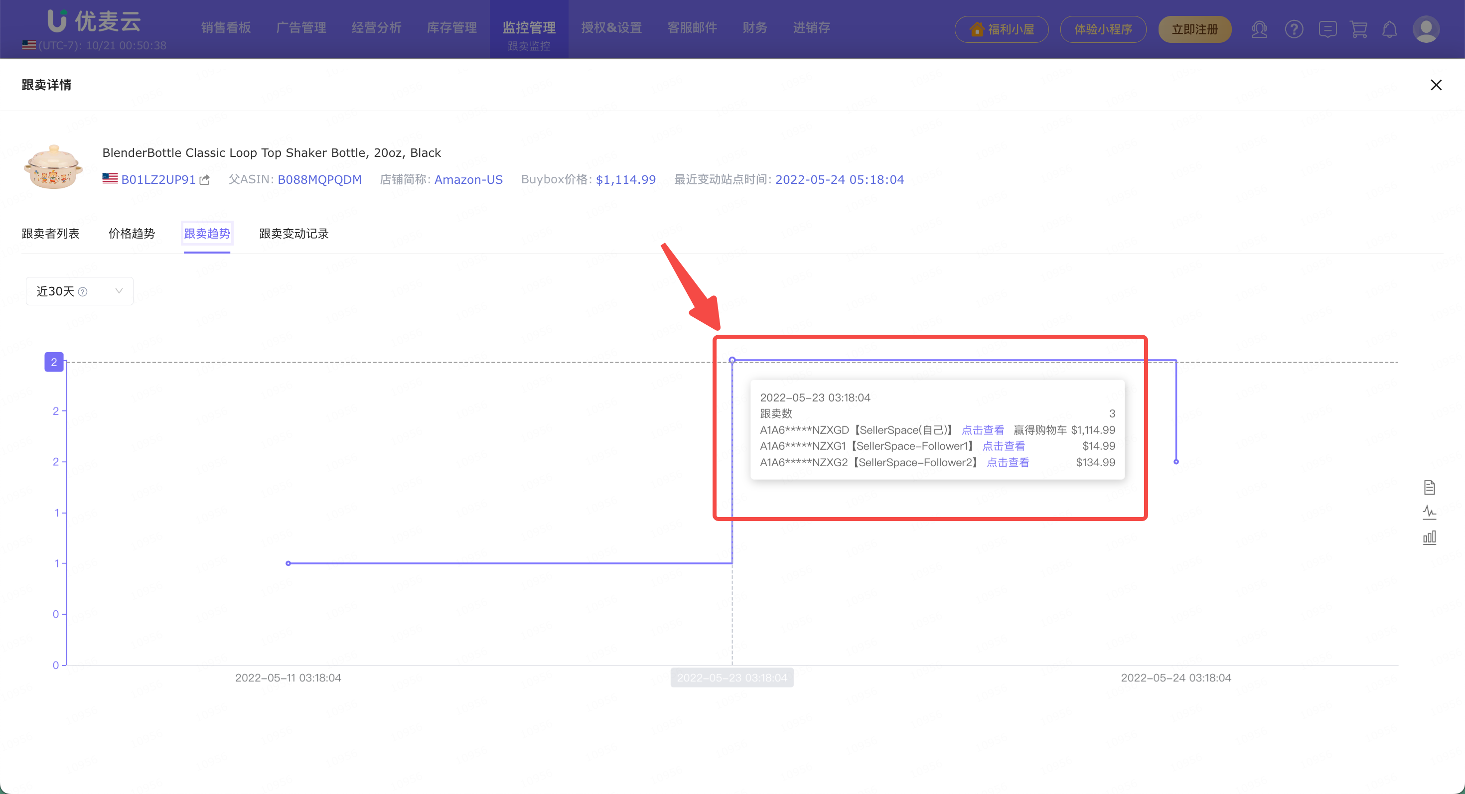 鼠标悬停图表,还可以查看对应时间点的跟卖详情。