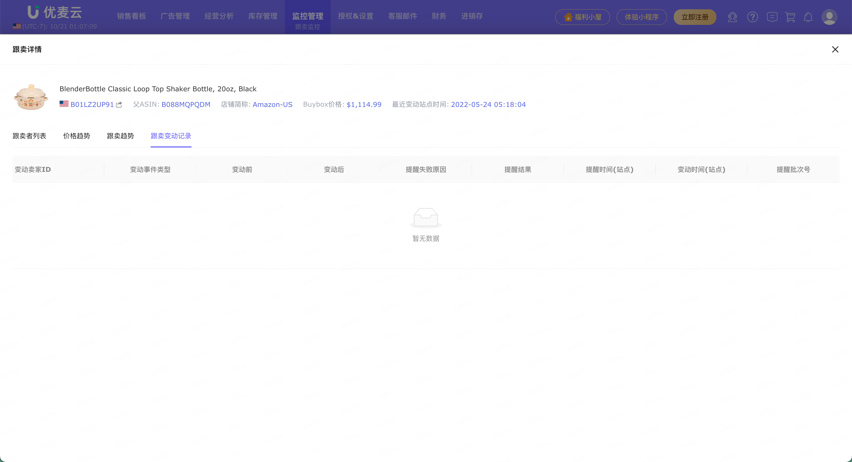 因此,刚加入监控时,可能出现有跟卖数,但是点击查看不到具体跟卖者信息的情况,这就是由亚马逊的通知机制导致,我们无法获取历史的情况。跟卖者商品信息发生变动,我们才会获取到该变化信息。