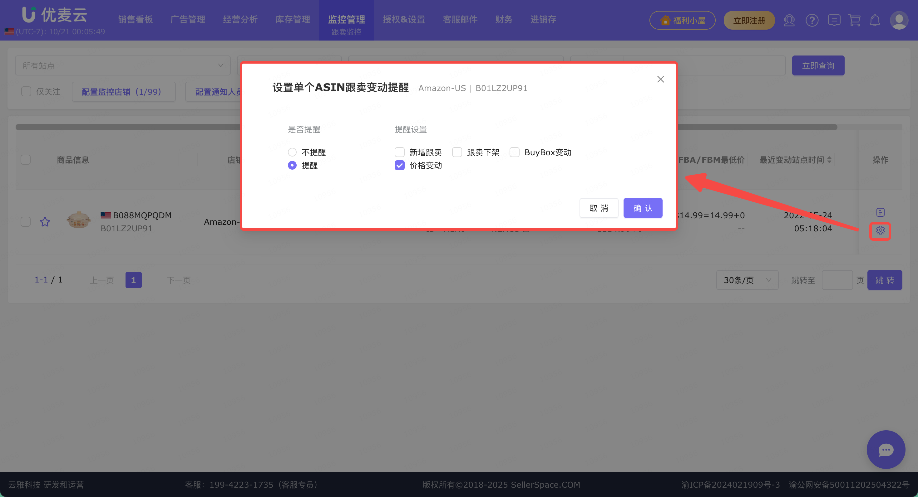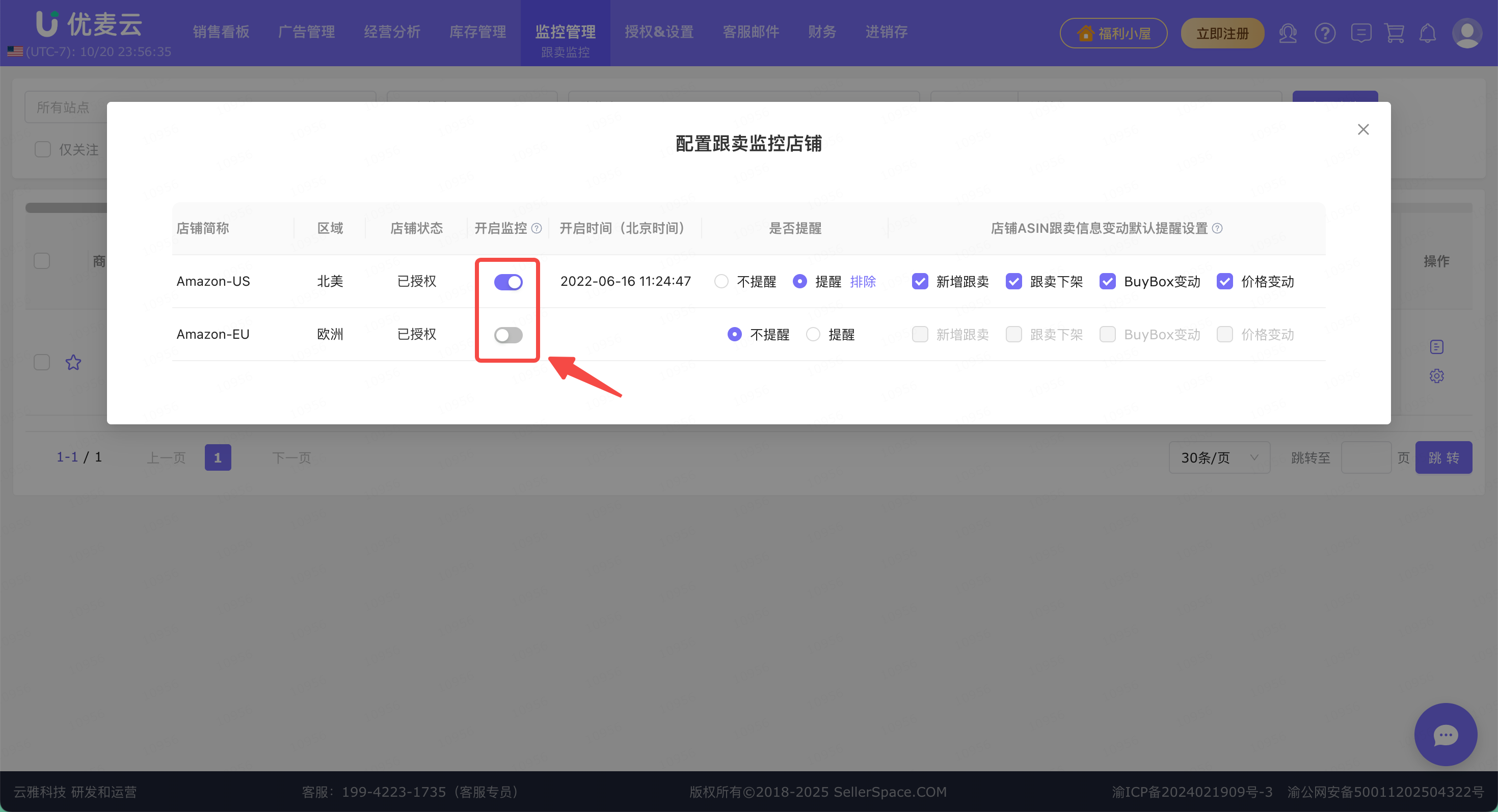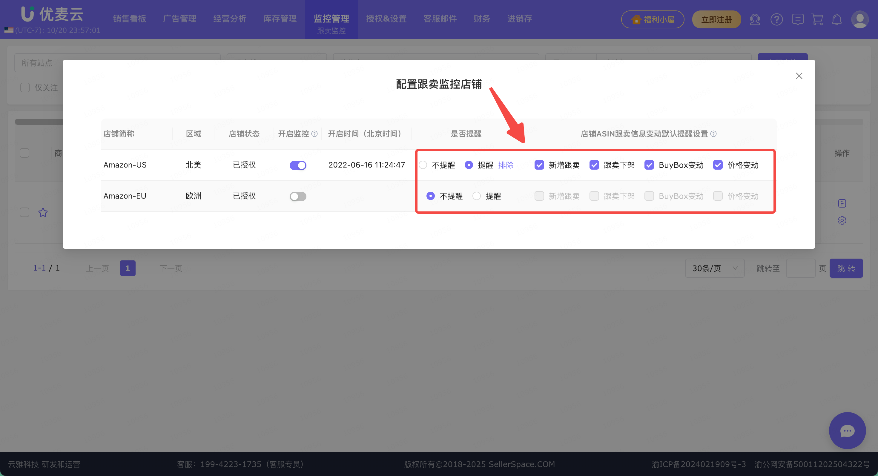 我们授权店铺后,就可以在「监控管理 -> 跟卖监控」功能中,开启跟卖监控,并且设置跟卖提醒功能。