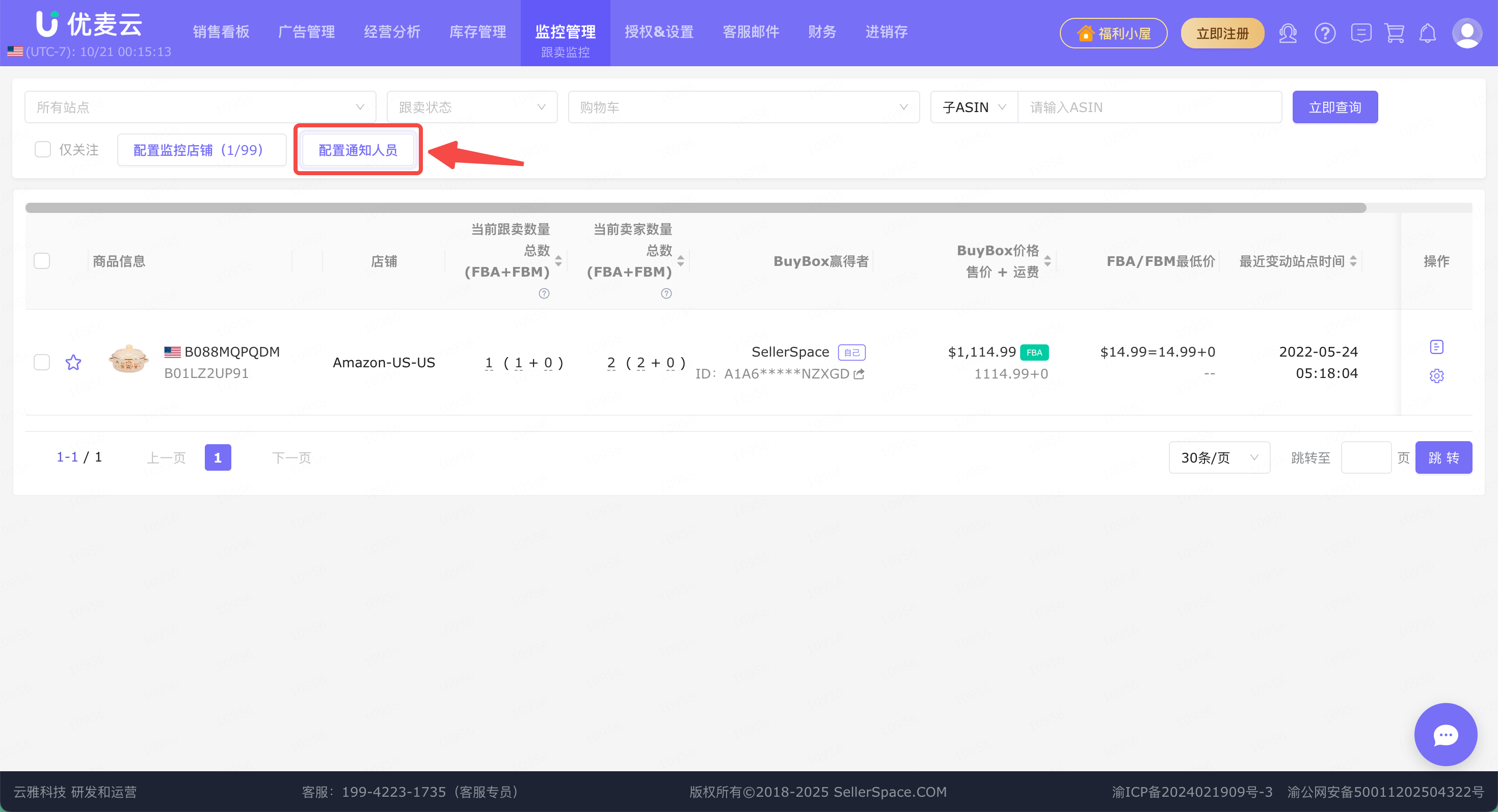 所有配置完成后,系统会自动监控已配置店铺内的所有产品,并在来了跟卖的时候实时通知对应人员。