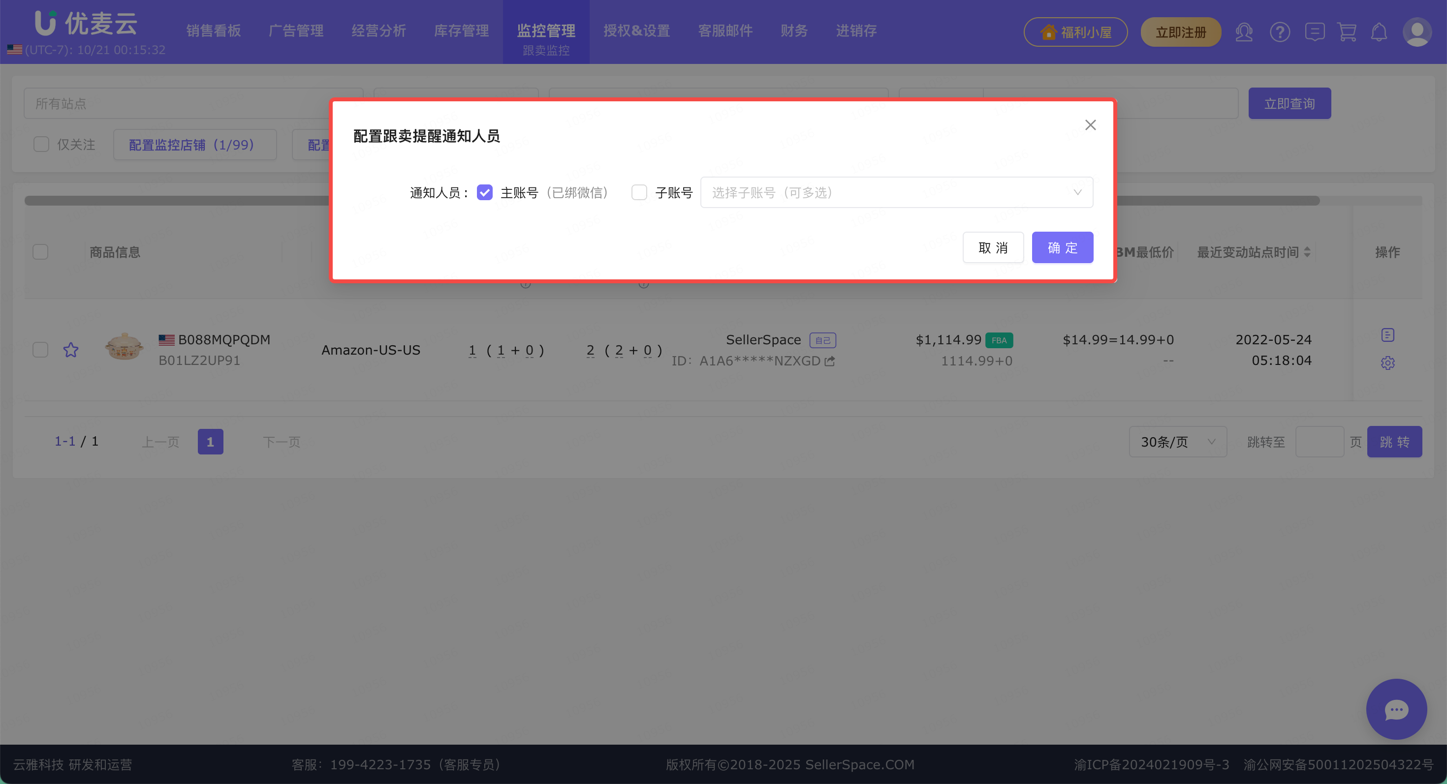 主账号进入「跟卖监控」功能,点击【配置通知人员】,进入配置页。