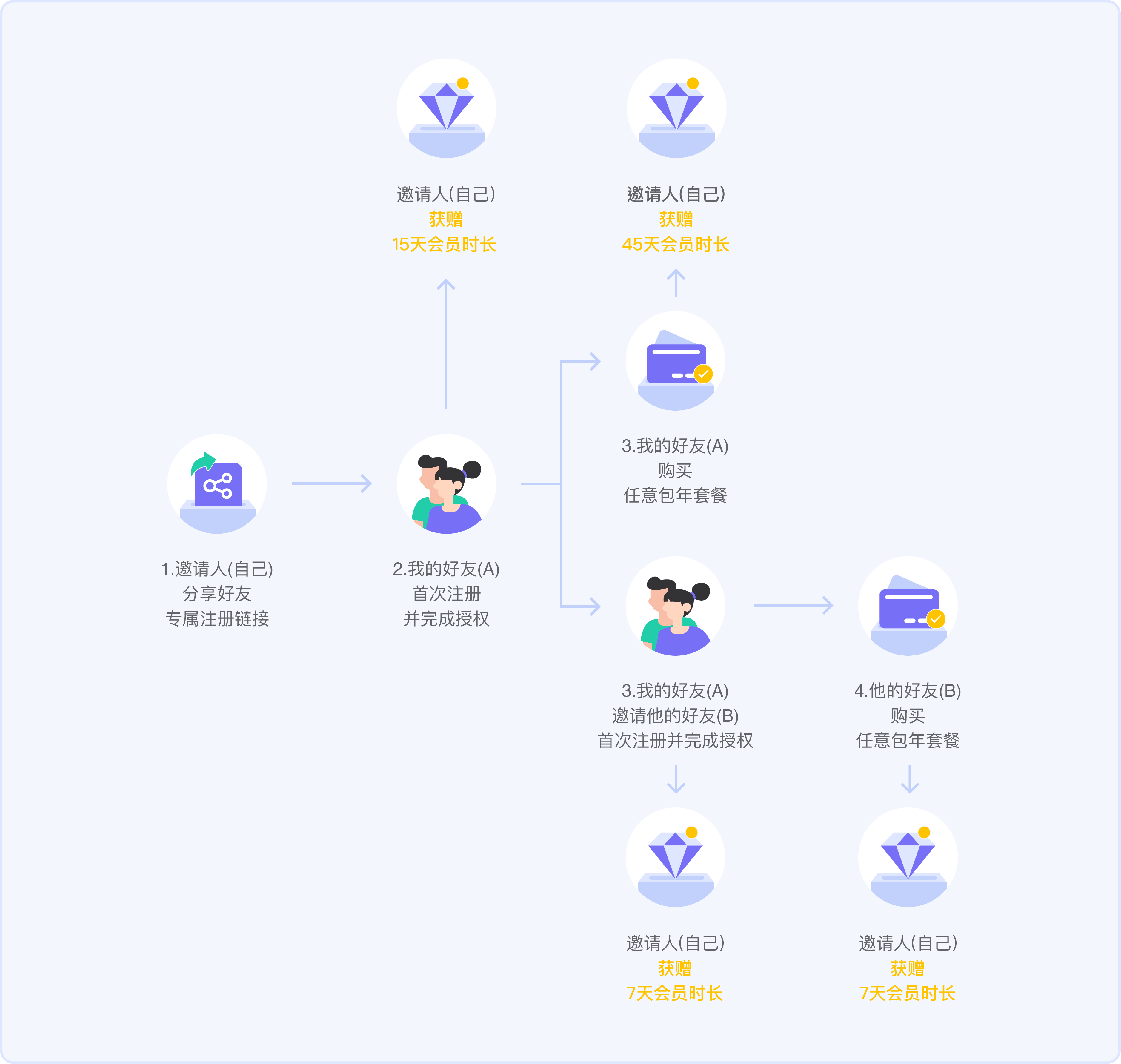 For free and monthly subscription users, you can invite up to 3 friends (that is, you can get a maximum of 3 months membership); for annual subscription users, there is no limit to the number of friends you invite, and the more you invite, the more you get!