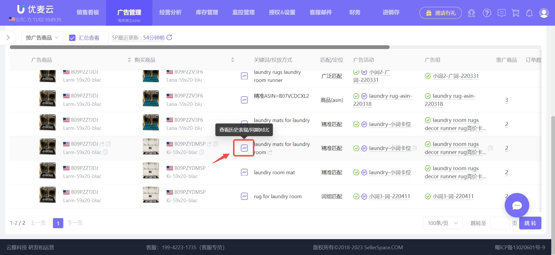 不过,如果一个商品投了多个广告,在这里一个一个筛选,可能会有点耗费精力,因此,我们为这个功能做了一个关联,在不同广告数据维度下,可以查看对应的【购买其他ASIN】数据。