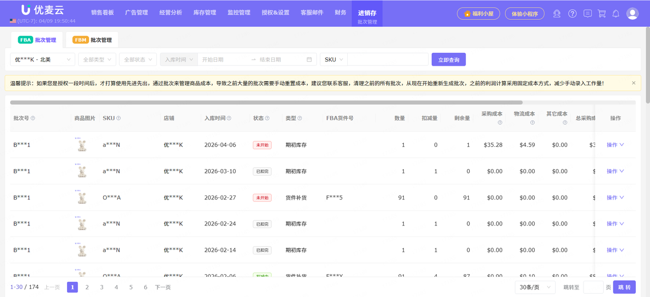 因此,想要节约时间,让系统自动同步批次成本,需要使用优麦云系统发FBA,并且发货时,认真填好每个步骤的费用信息,以保证最后的商品成本准确性。