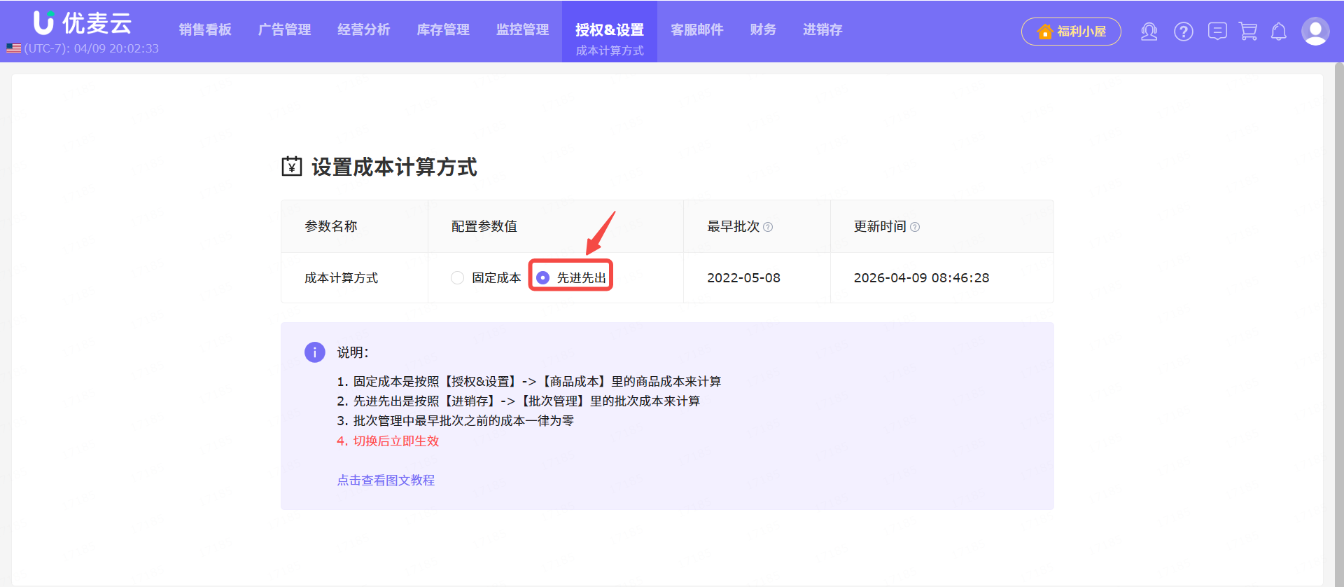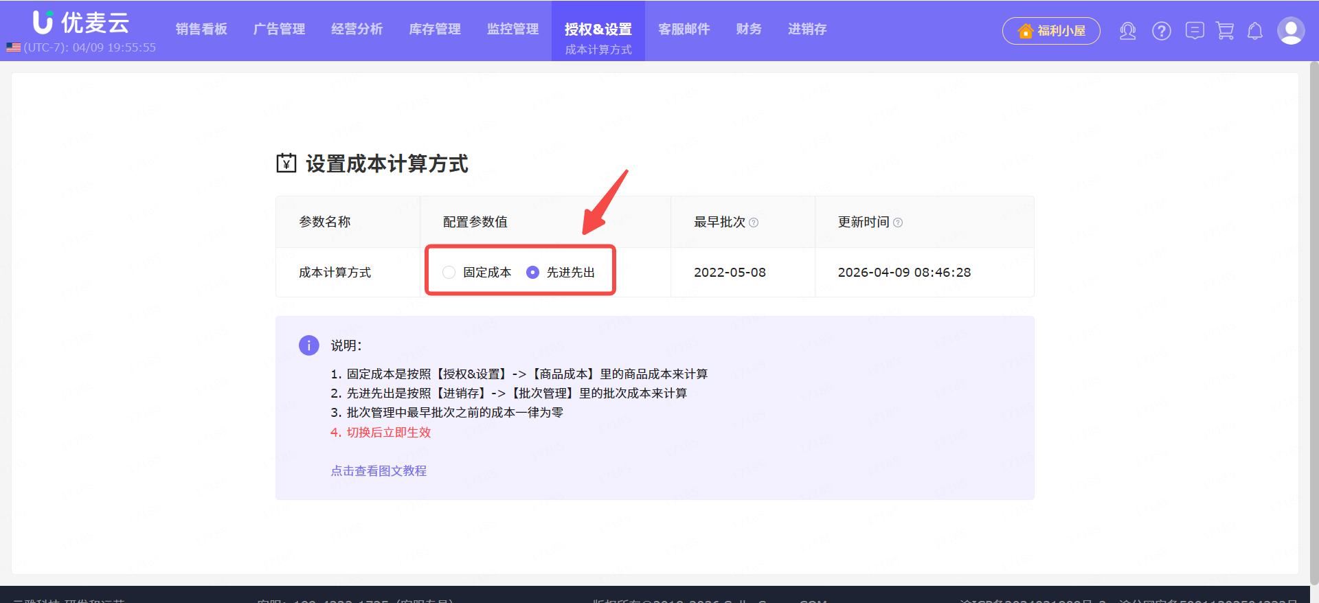 当我们确认并设置好“先进先出”库存扣减批次和成本后,需要将成本计算方式,调整为“先进先出”,之后店铺的利润计算,才会按照先进先出来。