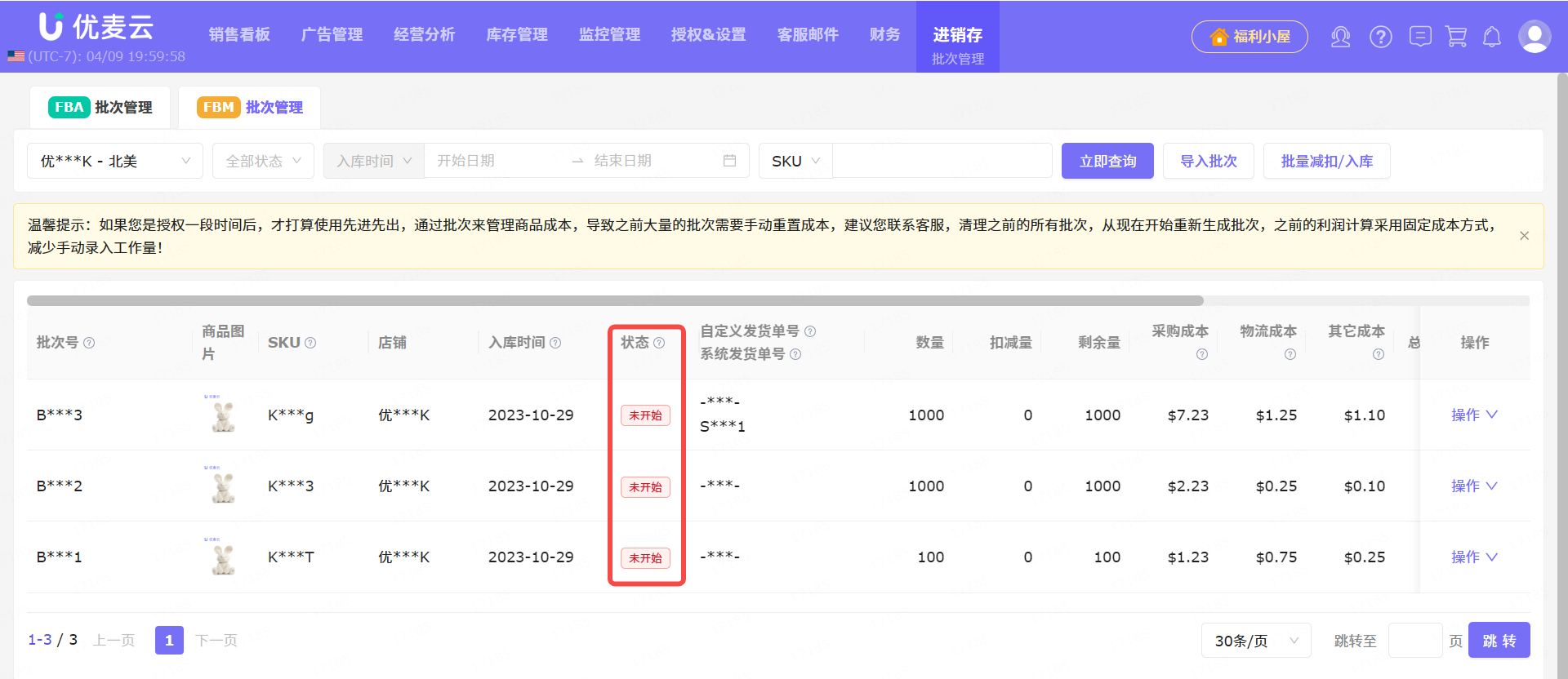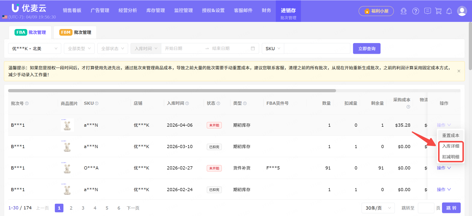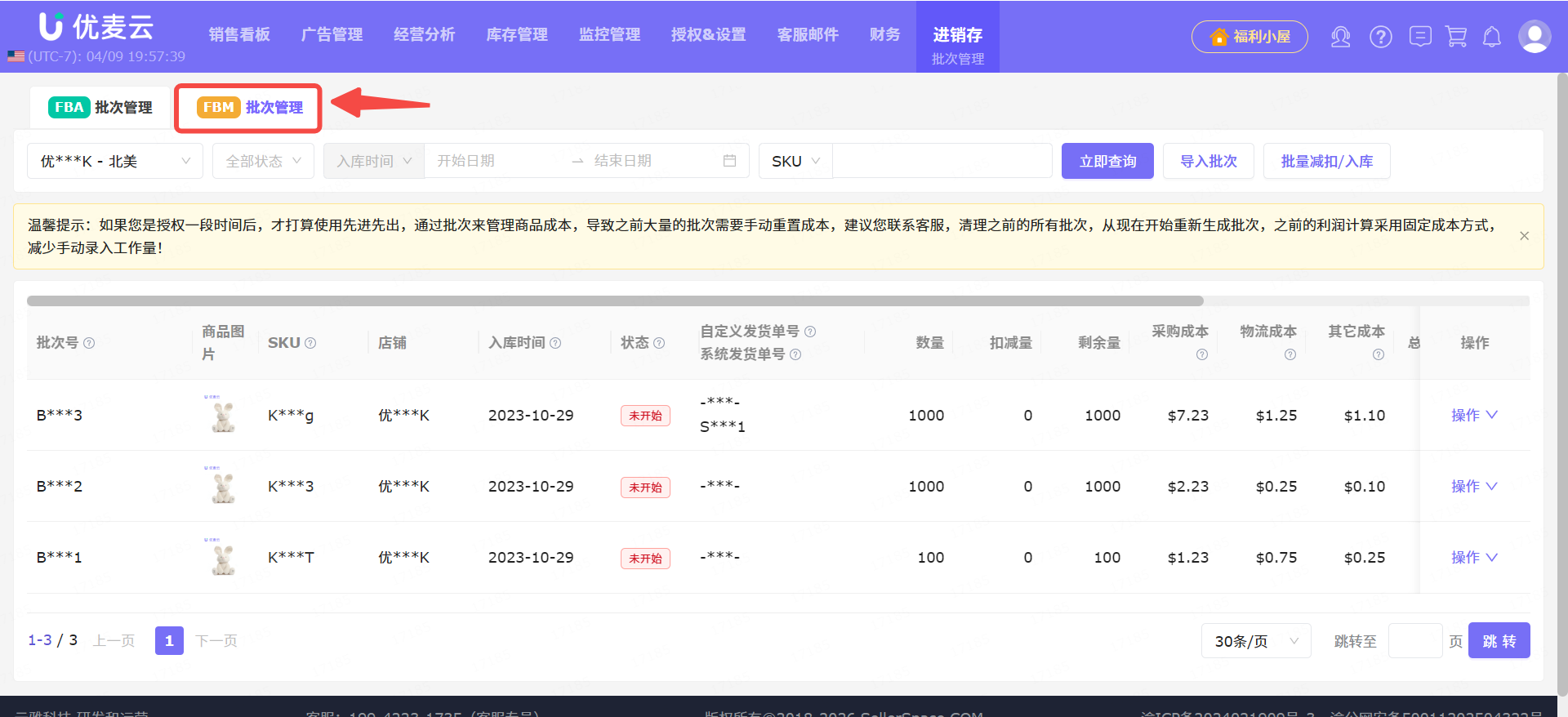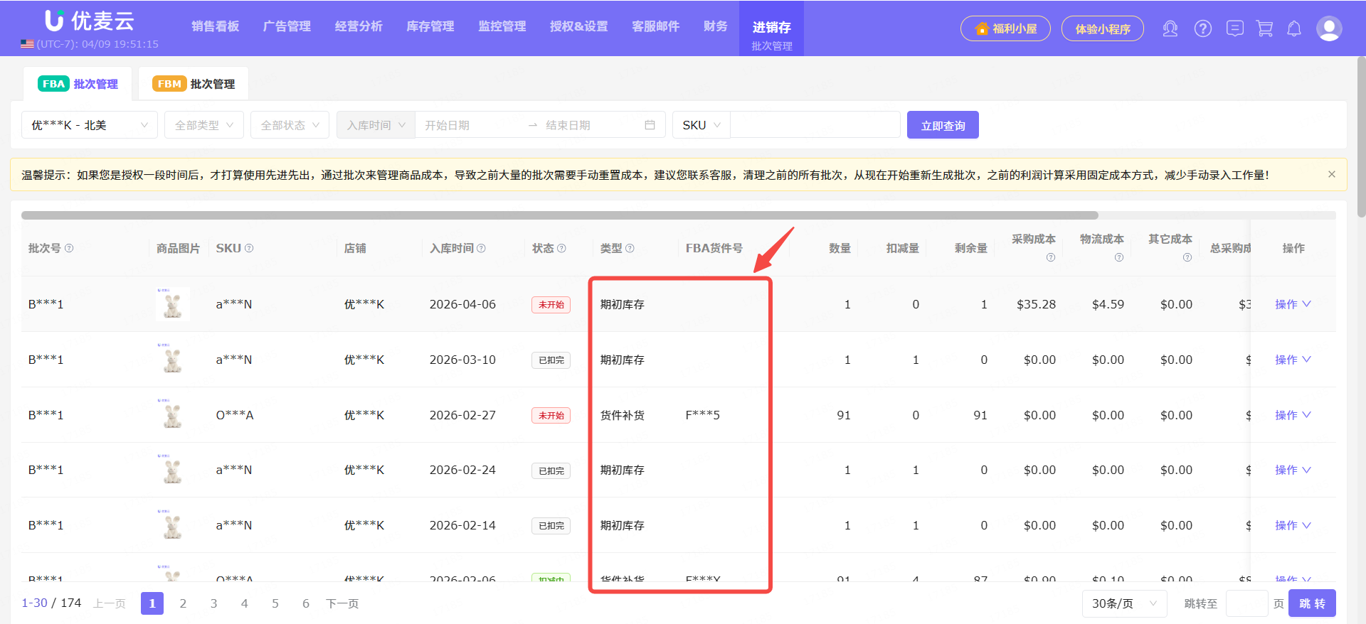 进入“FBA - 批次管理”页面,即可直接查看到对应类型的扣减批次。