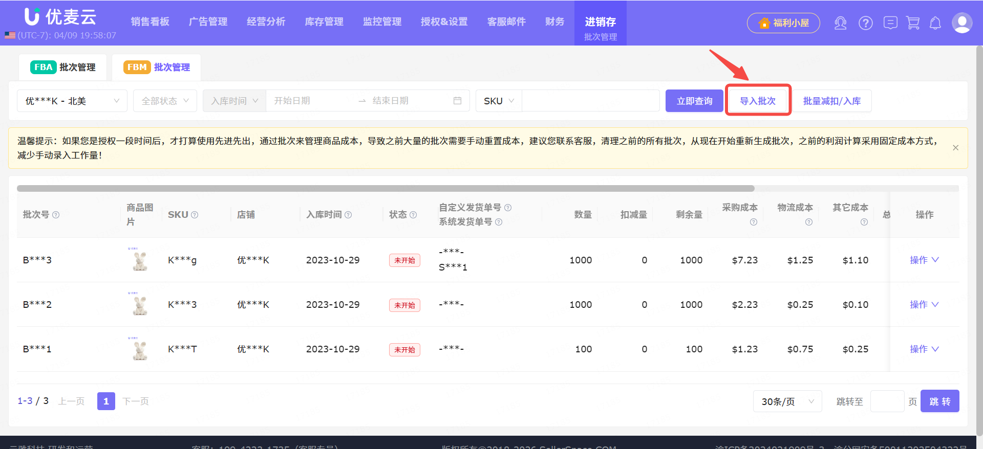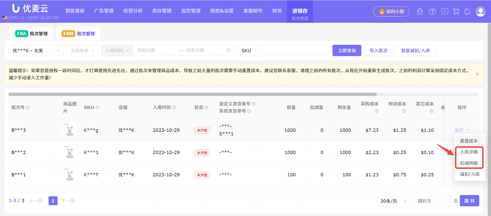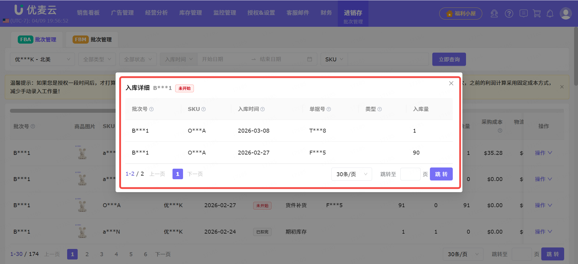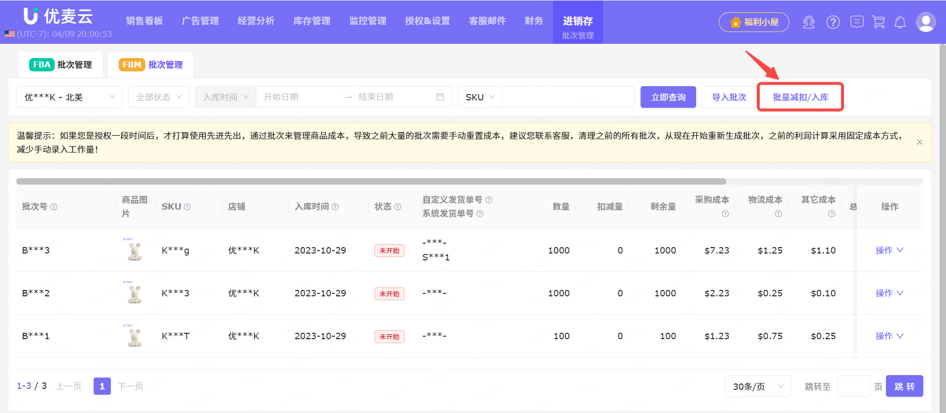 进入“FBA - 批次管理”页面,即可直接查看到对应类型的扣减批次。