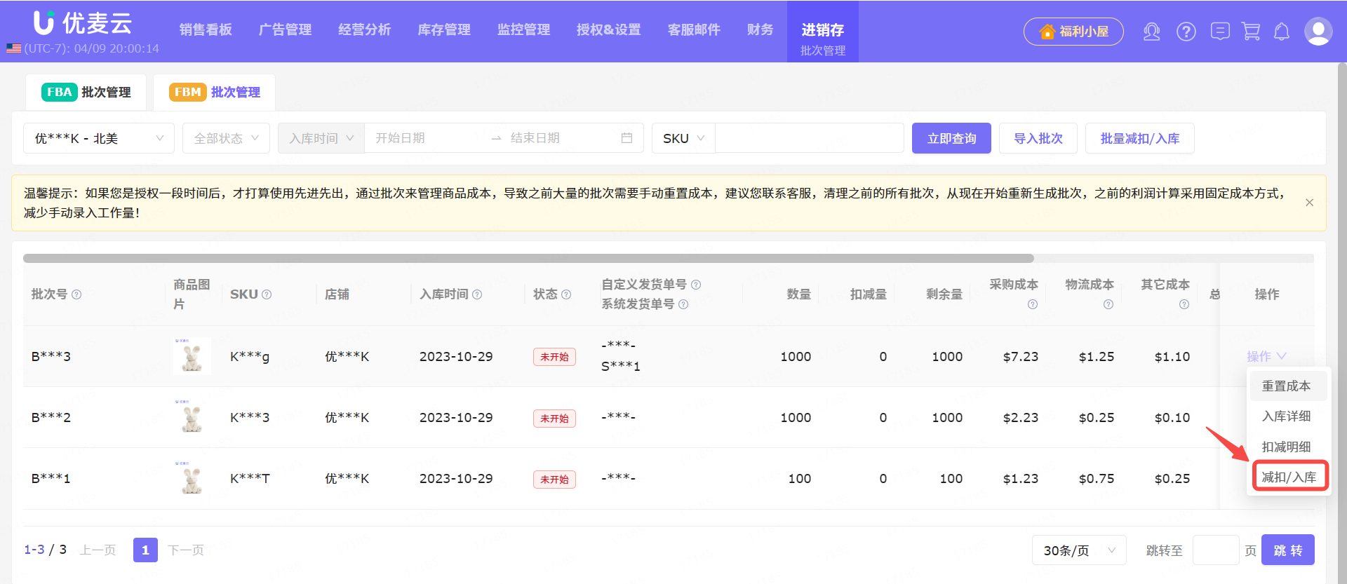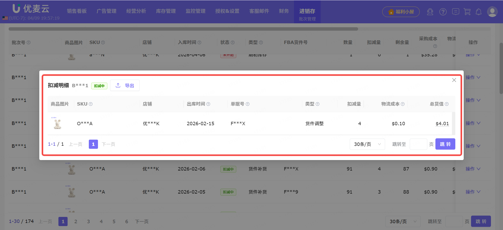 优麦云系统会根据FBA库存入库的先后顺序,自动生成对应扣减批次,依次扣减库存。