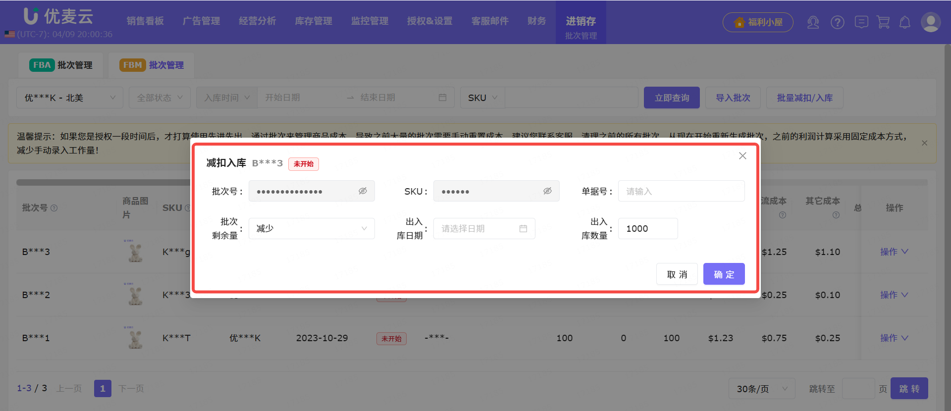 除了系统自动扣减FBM的批次库存,我们也可以人工调整FBM的批次库存。不过,只能调整非订单情况下的批次剩余数量,订单数据由系统自动调整出入库。
