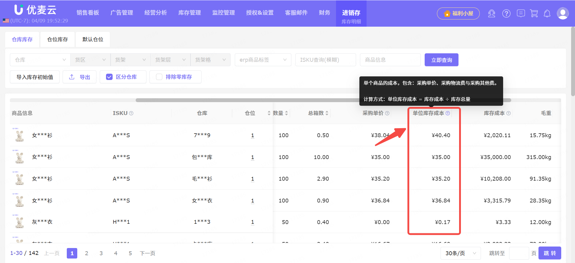 库存成本:“库存明细”功能中,查看到的该库存商品的单位库存成本。