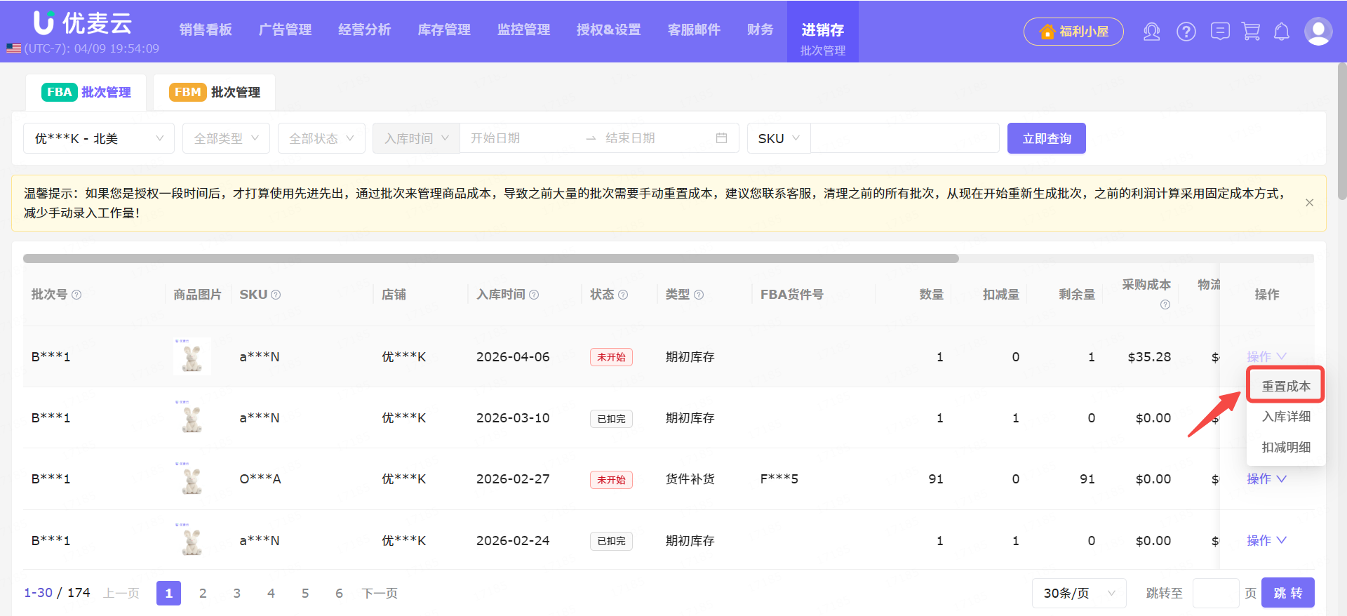 如果商品每次发货的货件数量和成本一样,则可以用【使用上批次成本】一键重置成本。