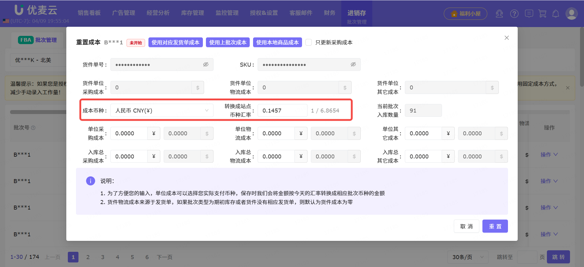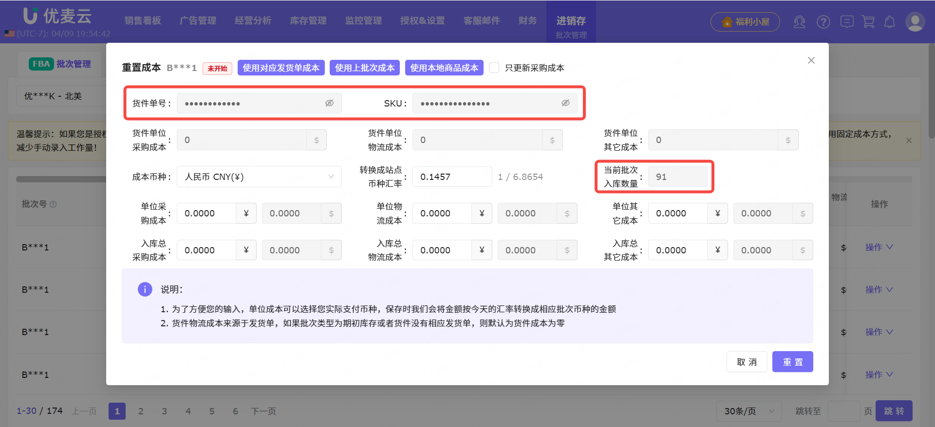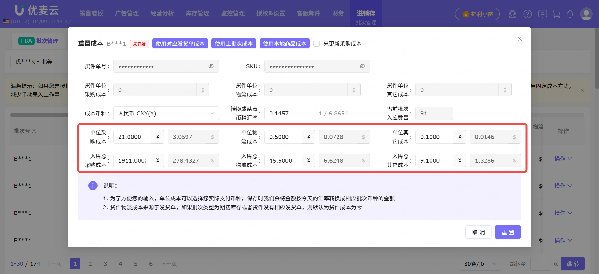 当系统按照FBA入库先后顺序生成扣减批次后,我们就可以设置每个批次成本了,目前只能单个批次设置。