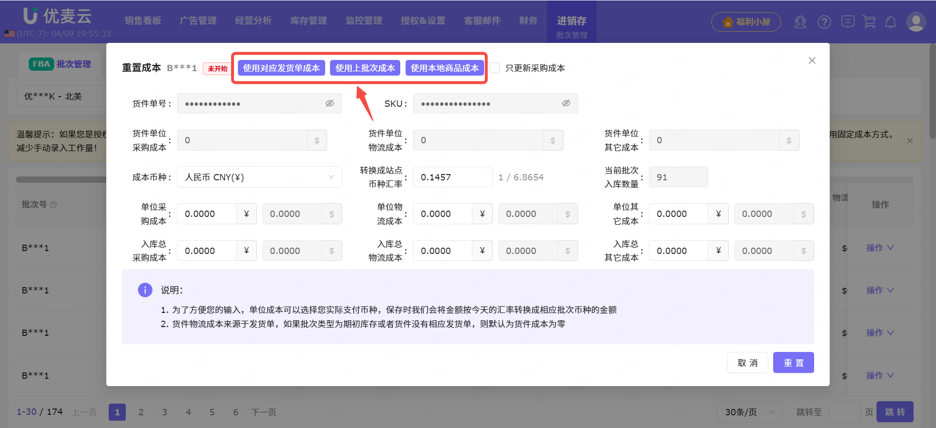 我们可以修改扣减批次的成本,但改动后,想要再次改回用货件成本,就可以通过【使用货件成本】,一键重置。