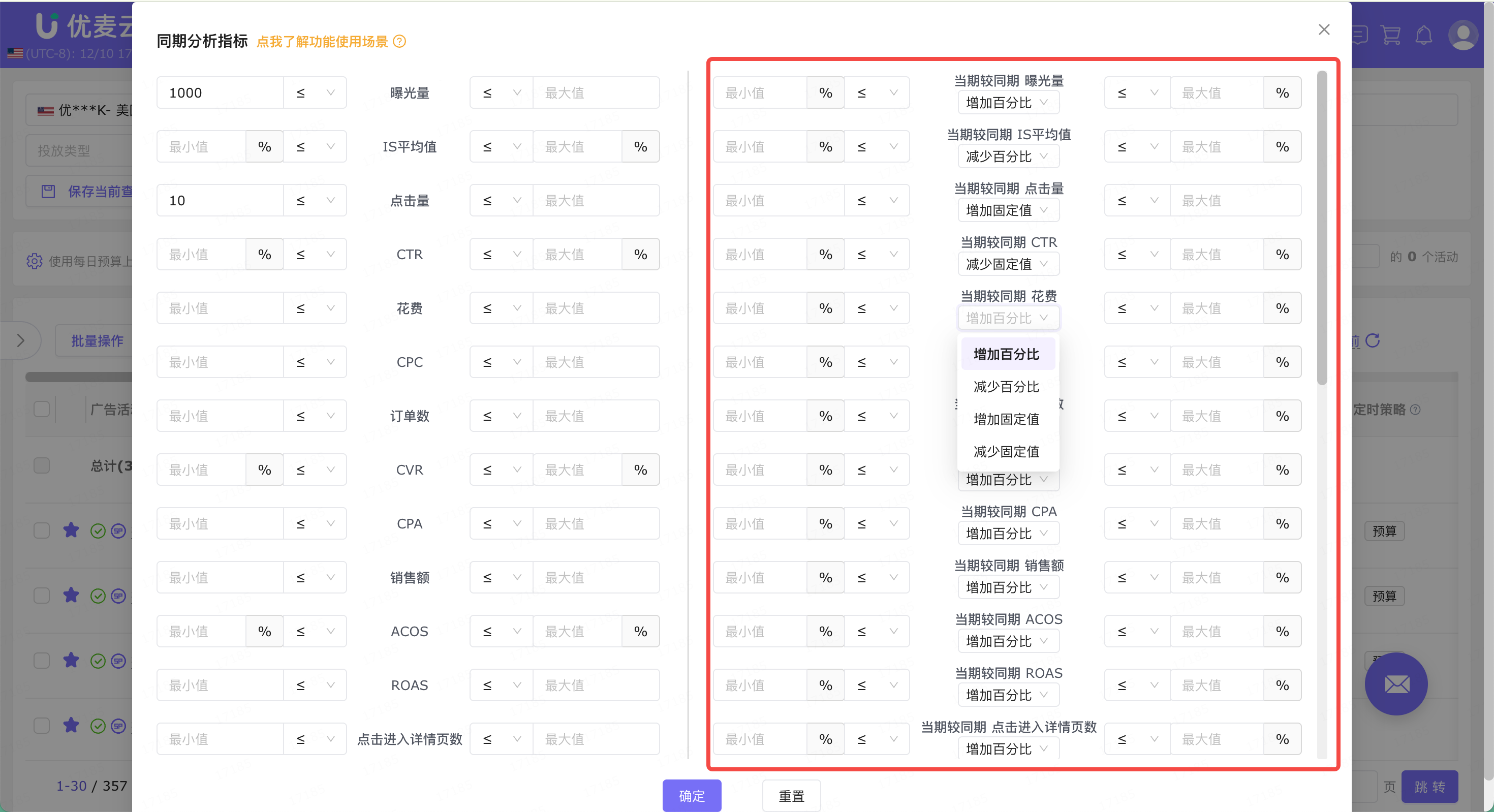 2. 设置关键指标与条件:根据你的目标(如找问题、挖潜力),组合指标(点击量、订单量、ACOS、新客占比等)和关系(大于、小于、变化百分比)。