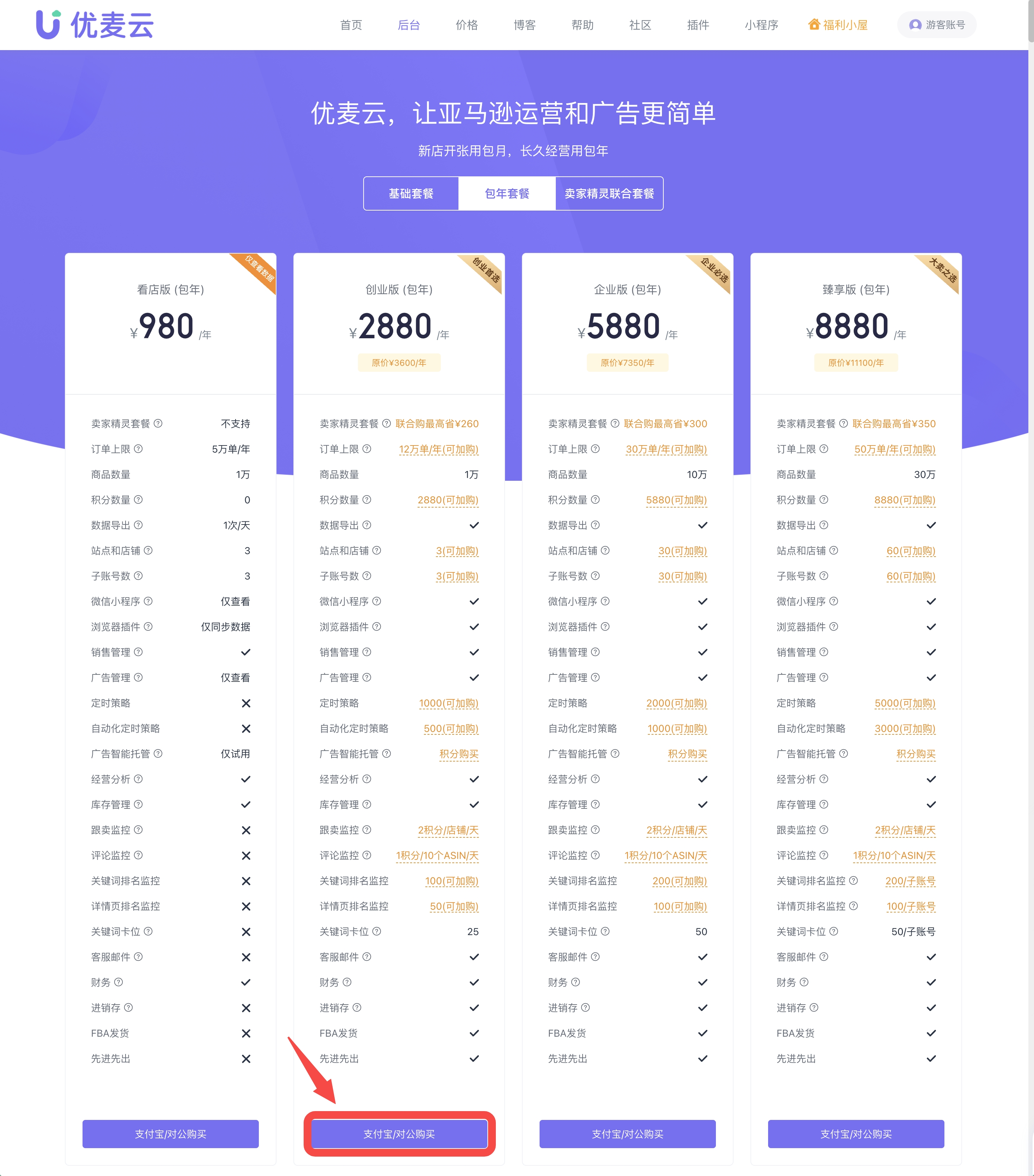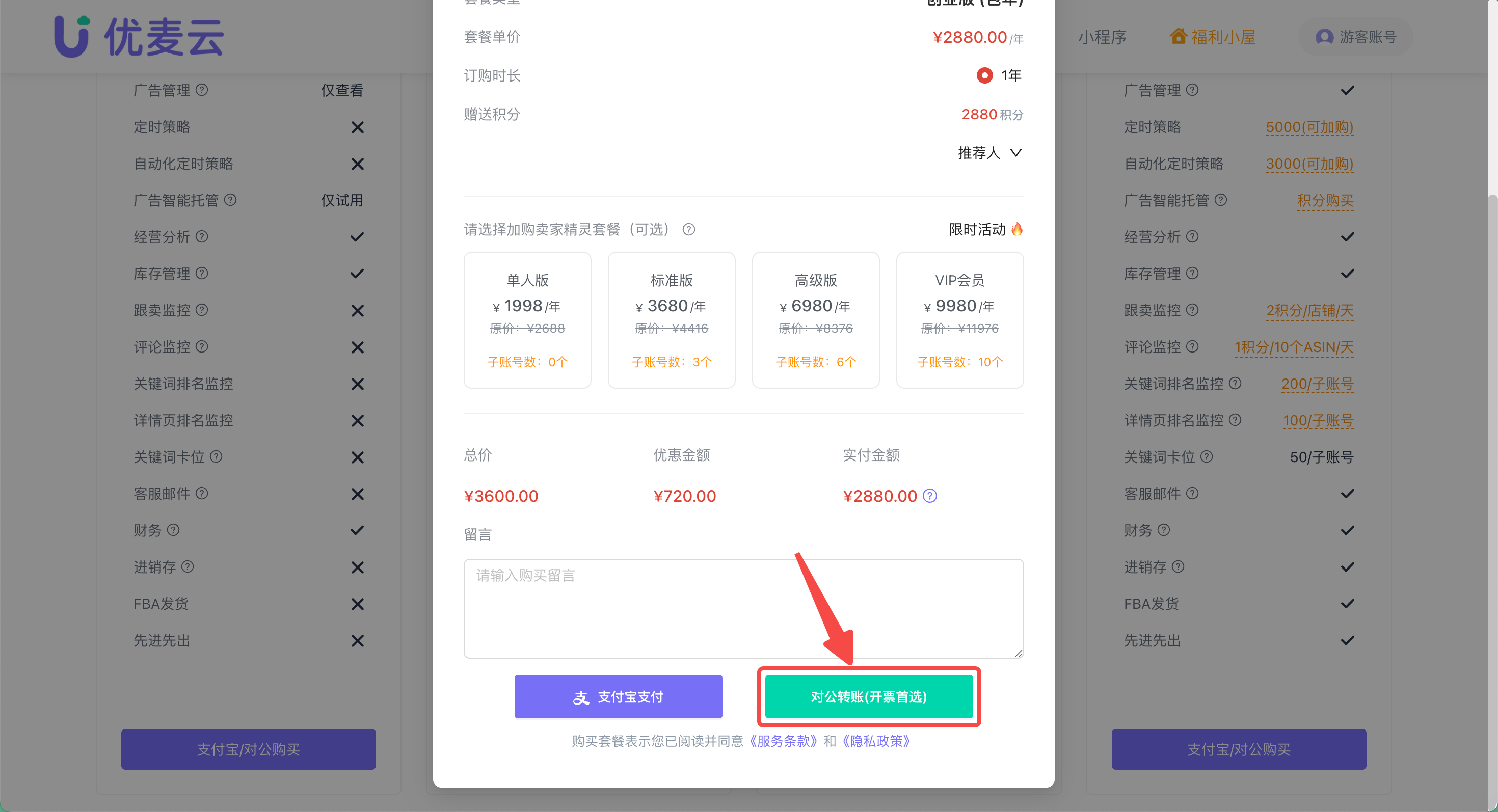 2. 进入价格页,选择要购买的套餐,点击对应套餐下方的【支付宝/对公购买】,进入下一步操作。