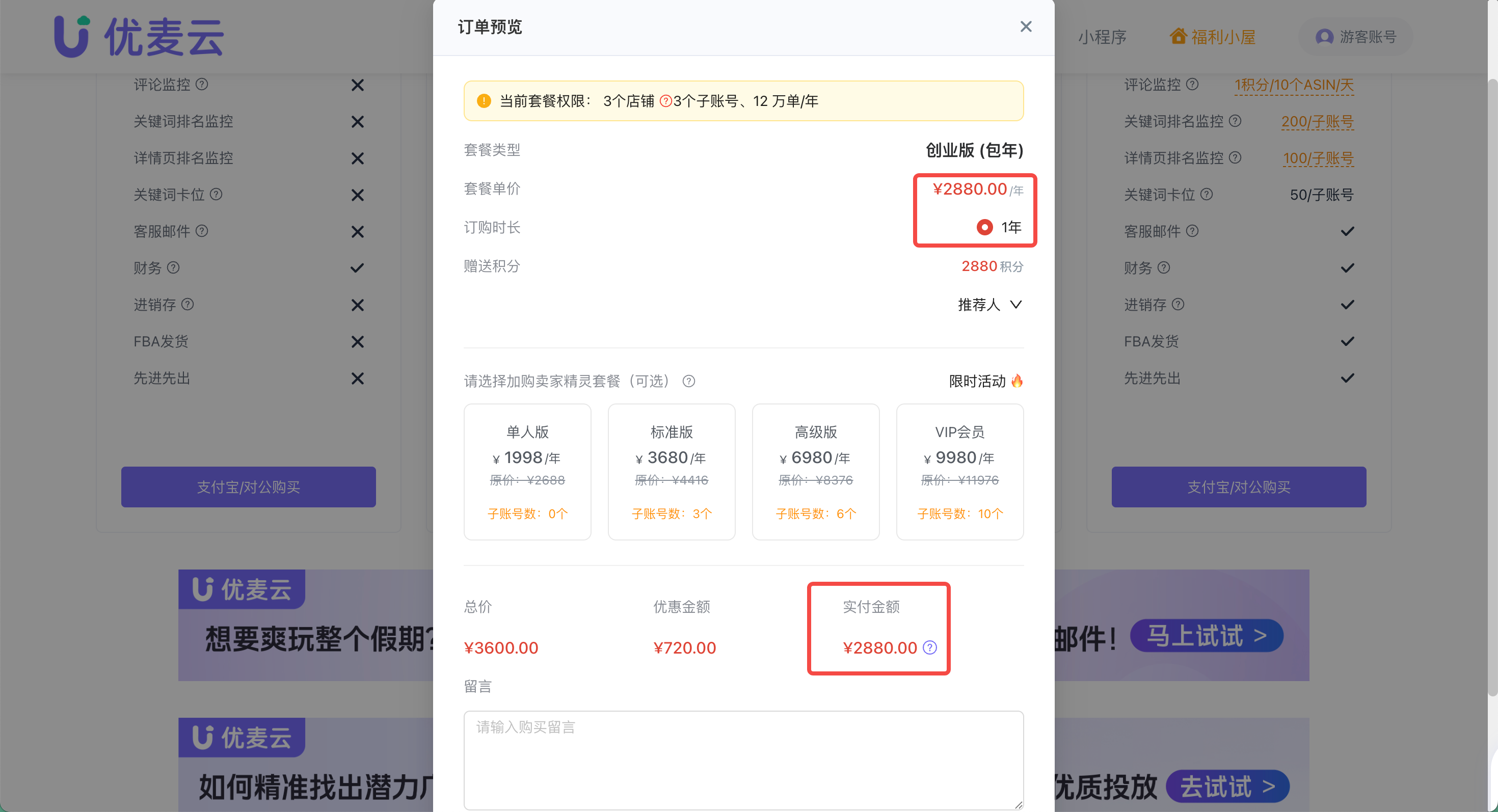 3. 进入“订单预览”页面,确认您要购买的套餐类型与金额;