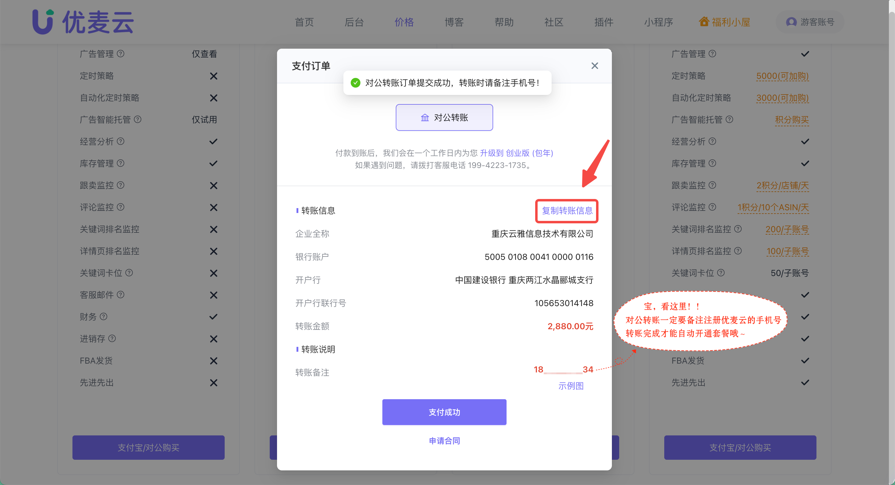 仔细阅读购买提示,按要求进行对公转账,转账时备注好对应优麦云账号手机号。